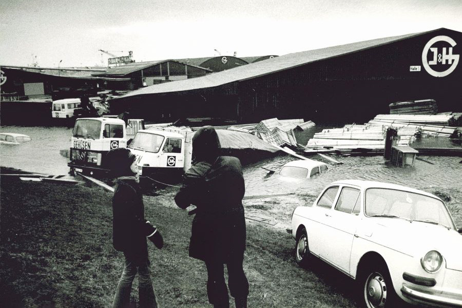 Am 3. Januar trifft das Orkantief „Capella“ mit bis zu 150 km/h auf die Nordseeküste – während einer Springtide. Die bis dato höchste gemessene Sturmflut drückt das Wasser unaufhaltsam in die Elbmündung und gegen die Deiche. Die teils über 100 Jahre alten Bollwerke können an vielen Orten im Kehdinger Land nicht standhalten. Die Wassermassen strömen weit ins Hinterland und richten immensen Schaden an.